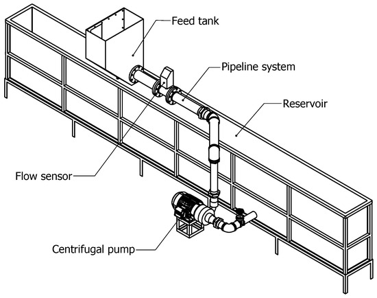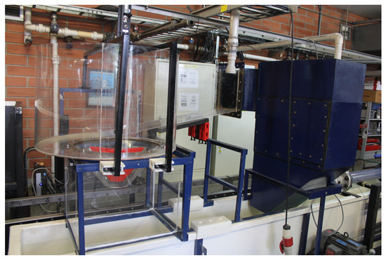 The optimal geometric configuration of the inlet channel and discharge cone was fabricated at a laboratory scale, followed by an experimental performance evaluation. The tests were conducted in a hydraulic channel specifically designed for hydrokinetic turbine analysis, enabling the characterization of flow hydrodynamics, energy conversion efficiency, and associated hydraulic losses. The experimental setup has a reservoir, a centrifugal pump IHM 30A-15W-IE2 (Ignacio Gómez IHM, Medellín, Colombia), a feed tank, and a pipeline system; see Figure 6. The setup enables the testing of various GVT configurations.