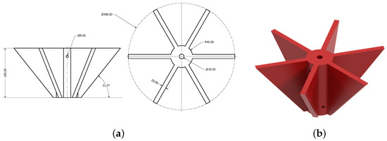 The turbine includes an inlet channel and a discharge cone, all constructed from acrylic to allow for flow visualization and to facilitate the hydrodynamic analysis of the system. The vortex turbine is installed after the feed tank. The turbine is connected to the feed tank through flanges. The feed tank plays a critical role in reducing turbulence from the pump and ensuring a steady, laminar water flow into the turbine’s inlet channel. In these experiments, a runner was used, as shown in Figure 7, featuring six blades with an upper diameter of 388 mm, a lower diameter of 80 mm, and a height of 180 mm. The runner design was primarily based on the model proposed by Edirisinghe [23], which consists of a conical runner with straight blades. The runner was manufactured using 3D printing with PETG, while its shaft was made of stainless steel to ensure strength and durability. The 3D printing process was optimized to achieve high mechanical strength and dimensional accuracy. The 3D printing setup consisted of a 245 °C nozzle, an 80 °C heated bed, and a print speed of 60 mm/s. A 0.2 mm layer height was chosen for a good compromise between print quality and duration. The infill density was set to 55% with a grill pattern to enhance structural integrity while minimizing weight. Additionally, the print was performed with an enclosed chamber to reduce warping and improve layer adhesion. These parameters ensured the runner’s durability, precision, and performance in experimental conditions.