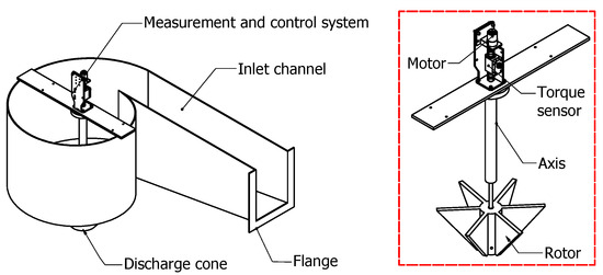 The feed tank, filled from its base by a pump, overflowed due to the rising water level, spilling into the inlet channel and then draining into the discharge chamber. This process generated a vortex, directing the water back to the reservoir and creating the hydraulic conditions necessary for turbine operation. The turbine was positioned at the vortex’s core to ensure direct interaction with the induced flow. It was mounted on a vertical axis and connected to the measurement and control system for the precise monitoring of its rotational behavior. The turbine rotated freely during the stabilization phase to ensure the establishment of steady-state conditions prior to further testing.