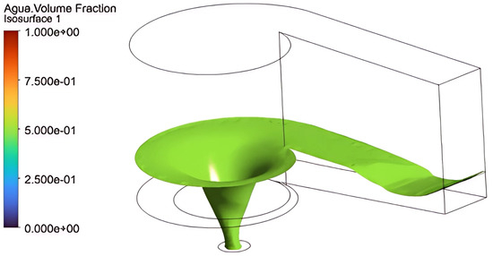 Upon completing the 27 simulations, the circulation results for the 3D models were obtained and are summarized in Table 3. The table presents an overview of the results, including overall circulation, phase percentage, and liquid-phase circulation. Figure 10 illustrates the hydrodynamic behavior of water flowing through a vortex structure in a GVT. The vortex formation suggests a strong rotational flow and effective water circulation within the system. The sharp definition of the funnel indicates a well-developed vortex, essential for energy generation applications.