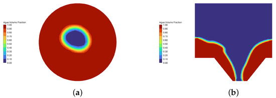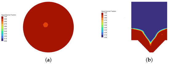 Figure 11 and Figure 12 show the water volume fraction for the models with higher and lower circulations, respectively. In both cases, subfigure (a) presents a cross-section at 50% of the cone height, while subfigure (b) displays a longitudinal section of the cone and inlet channel. The red region corresponds to the water within the vortex, while the blue areas represent air. Although a vortex forms in both cases, Figure 10 (Model 17) reveals the presence of an air core extending to the bottom of the cone, whereas in Figure 11 (Model 24), such a core is absent. This difference indicates that a higher circulation promotes air entrainment and the development of a more pronounced vortex structure. Additionally, the water volume fraction at 50% of the cone height differs significantly between the two models: for Model 17, it is 90.51%, whereas for Model 24, it is 99.75%. This variation highlights the influence of circulation intensity on the extent of air entrainment and the overall vortex dynamics within the system. The superiority of Model 17 in terms of circulation is due to a synergistic combination of its geometry, water fraction, and mass flow, which together create optimal conditions for a high circulation.