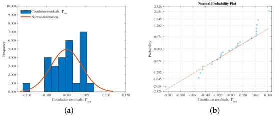 Along with R-squared and p-value, the model validation requires checking that the regression model meets statistical assumptions and fits the CFD data. This involves residual analysis (the difference between observed and predicted circulation values) [37,52,53]. Specifically, it is essential to validate the normality, independence, and constant variance of the residuals. If these analysis are not met, the regression model lacks statistical validity, potentially leading to biased predictions, unreliable confidence intervals, and misleading conclusions.
