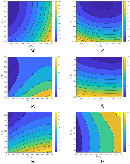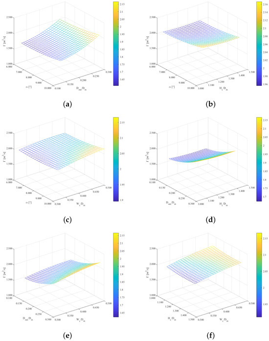 From Figure 15a, the highest circulation values occur at higher values of D o u t / D i n and α . From Figure 15b, the highest circulation is achieved when H c is above 1.35 and α exceeds 9°. In Figure 15c, the combination of a higher W c / D i n and a larger α results in maximum circulation. In Figure 15d, the highest circulation is observed when H c / D i n and D o u t / D i n are both high. In Figure 15e, the optimal condition for circulation occurs when W c / D i n and D o u t / D i n are maximized. Finally, in Figure 15f, the highest circulation values are achieved when H c / D i n is high and W c / D i n is low.