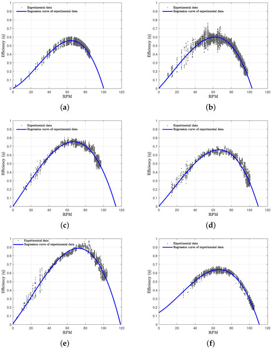 The curves presented in Figure 16 show the results obtained for each scenario, for flow rates ranging from 3.3 to 9.4 L/s. In Figure 16a, efficiency increases gradually with rotational speed, peaking at around 70 RPM before declining, indicating an optimal speed for maximum performance. A similar trend is observed in Figure 16b, although the peak efficiency is slightly higher and occurs between 70 and 80 RPM. Figure 16c presents a smoother, more pronounced efficiency curve, with a peak at approximately 75 RPM, suggesting enhanced performance at higher flow rates. In Figure 16d, the peak efficiency is observed near 80 RPM, with a broader curve indicating greater stability across a wider range of rotational speeds. Figure 16e shows a well-defined curve peaking at around 85 to 90 RPM, reflecting a higher overall efficiency and better utilization of increased flow. Notably, the highest efficiency of all scenarios, 0.8770, was achieved in this case at 71.54 RPM with a flow rate of 8.9 L/s. Finally, in Figure 16f, the highest flow rate produces a broader efficiency curve, peaking at 85 to 90 RPM. Despite minor fluctuations, the curve suggests stable performance over a wide RPM range.