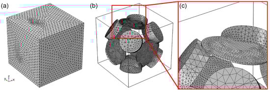 Equations (1) and (4) can be executed using finite element solvers. In the model, inside the domain of solid materials, the shear viscosity is assigned a value of zero, resulting in the simplification of Equation (4) to Equation (2). In the model for compressible viscous fluids, the shear modulus G is set to zero, which simplifies Equation (4) to the linear compressible Navier–Stokes Equation (3). A benefit of the aforementioned equations is the natural coupling of solid and fluid displacements at domain boundaries [].
