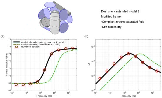 The dry moduli of the isotropic dual crack model and the anisotropic dual crack model are obtained through numerical simulations of the models []. In the saturated dual crack model, numerical simulation is also used to compare and validate the analytical model, demonstrating that the dual crack model can describe the squirt flow mechanism at various frequencies in different geometric models.
