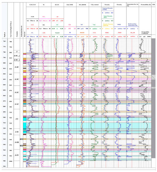 The interpretation is presented as a saturation profile of the reservoirs. The conventional symbols employed encompass water-bearing, oil-bearing, gas-bearing, combined saturation zones, and intervals that have undergone alteration during the developmental process. The logging data comprise gamma ray (GR), spontaneous potential (SP), acoustic (AC), resistivity gamma-gamma (RGG), resistivity, and porosity curves. These have been shown to reliably allow for the evaluation of reservoir saturation characteristics.