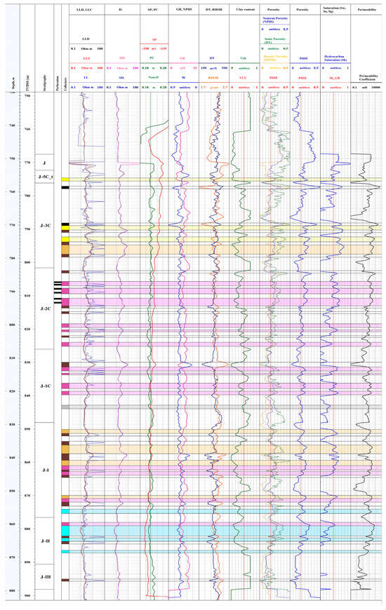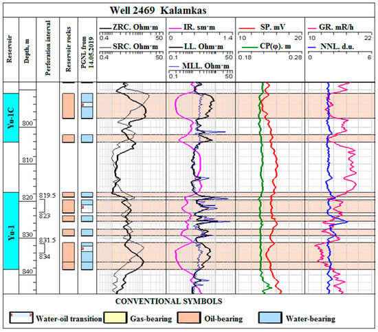 In the water-saturated reservoir, the IL and LL curves demonstrate “sinusoidal” variations in the intervals 823.3–835.4 m and 844.2–846.4 m (horizons Yu-3S, Yu-2S). A similar pattern is observed in instances where reservoir rocks become water-saturated due to development, or when the well is inadequately prepared for logging operations. However, in the absence of further data, the well has been reinterpreted, leading to the conclusion that the reservoir rocks are located against horizons Yu-3S and Yu-2S. These rocks have been assessed as water-saturated, indicating that they have been altered by development.