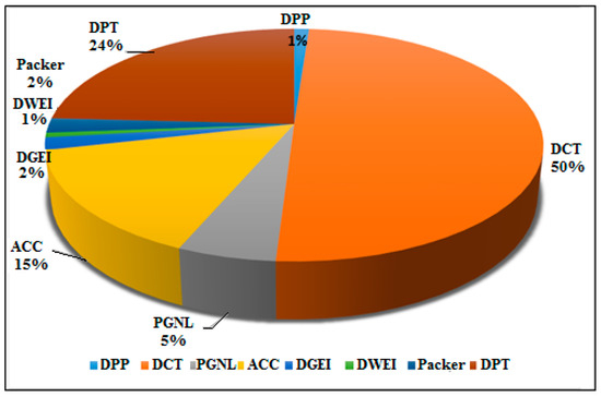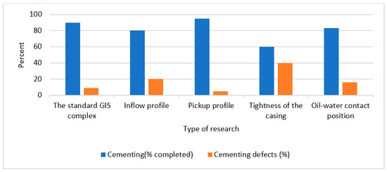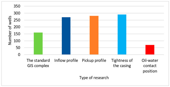 During the analysed period, geophysical surveys in producing wells were carried out to determine column tightness and pickup profile (DCT PP), working intervals, water inflow intervals, string failures during compression (DCT WF), gas inflow location, packer tightness, tracing of liquid level, and water–oil interface. The abovementioned studies were performed in 1217 wells; in 538 wells, 607 studies were performed to determine the tightness of the string; in 20 wells, the determination of gas entry intervals (DGEI) was performed; determination of water entry intervals (DWEI) was performed in 8 wells; and packer stripping was performed in 24 wells.