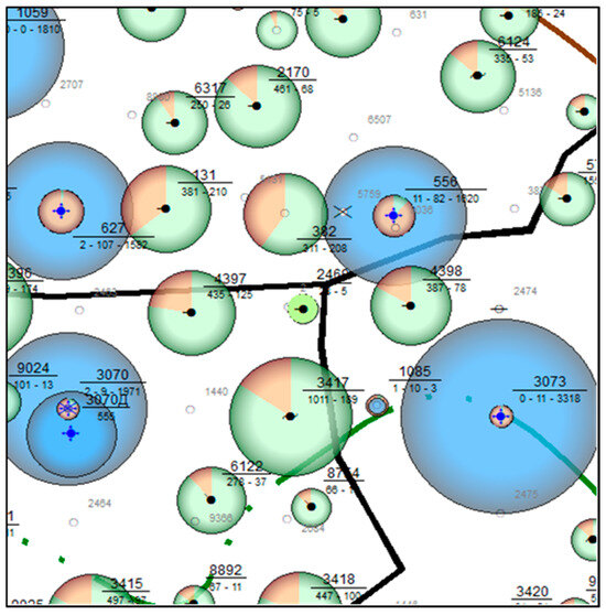 As illustrated in Table 3, the following categories of faults were identified during geophysical monitoring surveys in production and injection wells during the period under analysis. From 2018 to 2020, the number of recorded technical faults in the production well stock increased from 41 to 69, which may indicate the need for timely geological and technical interventions (GTM). A similar trend is observed in the injection well stock, where the number of faults ranged from 58 to 47, with a consistently high proportion of casing defects and problems with isolation integrity.