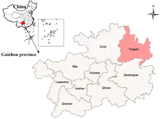The test field was located in a typical karst region, which belongs to the subtropical monsoon humid climate zone, with high temperature and precipitation in summer and low temperature and precipitation in winter []. The field experiment was located in farmland (27°32′18″–27°52′40″ N, 108°56′13″–109°28′20″ E) in Tongren City, Guizhou, China, in a typical karst area, belonging to the Hg and Cd composite contaminated soil, with sampling depths of 0–20 cm. The physicochemical properties, including pH, organic matter (OM), available phosphorus (AP), available potassium (AK), total Hg, and total Cd concentrations, are summarized in Table 1. The geographic locations of the soils are shown in Figure 1. The levels of Hg and Cd in the test soil were higher than the standard limit values in GB15618-2018 (1.0 mg·kg−1 for Hg; 0.8 mg·kg−1 for Cd) []. Based on the assessment of soil environmental quality, including indicators such as pH, heavy metal concentrations (specifically Hg and Cd), and OM content, both Hg and Cd concentrations exceeded the standard limits, indicating that the soil is contaminated with a combined Hg-Cd pollution. The comprehensive evaluation classified the tested soil as a strictly controlled category in terms of environmental quality.