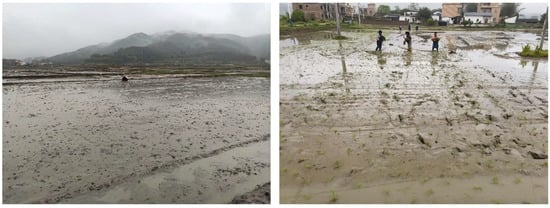Prior to the experiment, the farmland was divided into small plots and irrigated to maintain soil moisture and prevent desiccation. The soil amendments were applied and thoroughly mixed into the soil 5–7 days before transplanting (Figure 2). The experimental area was managed under a standardized protocol, including uniform seedling cultivation, transplanting, fertilization, pesticide application, harvesting, yield measurement, and analytical testing methods. The growth status of rice seedlings in the field was monitored regularly, and water was supplemented as needed. During the seedling, panicle initiation, and full heading stages, special attention was given to the prevention of rice blast, while during the tillering and booting stages, measures were taken to control rice planthoppers and stem borers. Upon maturation, the rice was harvested for subsequent determination of relevant indicators.