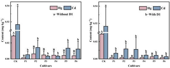 The Hg and Cd accumulation capacity of different rice varieties, where (a) without application of the D1 soil conditioner; (b) with application of the D1 soil conditioner (D1, 150 kg/mu). Note: Different lowercase and uppercase letters indicate significant differences in Hg and Cd accumulation among different rice varieties (p < 0.05).