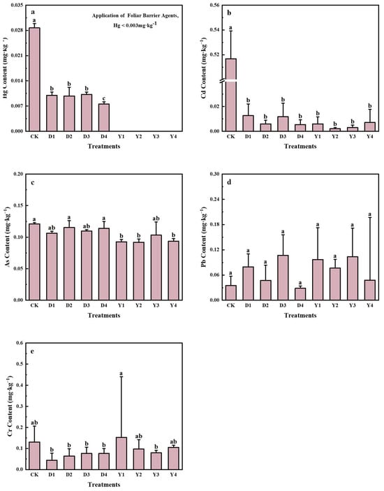 Effects of different soil amendments on the concentrations of heavy metals Hg (a), Cd (b), As (c), Pb (d), and Cr (e) in rice. Note: CK represents the untreated control, D1–D4 correspond to amendments D1, D2, D3, and D4, respectively, while Y1–Y4 denote their combinations with a foliar regulator. Different lowercase letters indicate significant differences in Hg and Cd content in rice at p < 0.05.