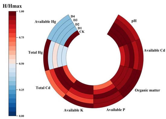 Soil amendments have a significant effect on improving soil physicochemical properties and reducing the bioaccumulation of heavy metals (such as Hg and Cd) in rice. The application of soil amendments significantly reduced the available Hg content in the soil (Figure 5), while also inhibiting the accumulation of heavy metals in rice (Figure 4). After the D1 treatment, the available Hg content in the soil decreased from 0.078 mg·kg−1 to 0.023 mg·kg−1, and the Hg bioaccumulation factor (BCF Rice Hg) in rice decreased from 0.0023 to 0.0018, indicating that D1 has a passivating effect on Hg in the soil. Similarly, after the application of D2, D3, and D4 treatments, the effective Hg content in the soil also decreased, and the BCF Rice Hg showed varying degrees of reduction. Notably, the D3 treatment reduced the BCF Rice Hg to 0.0009, demonstrating the best passivation effect on Hg.