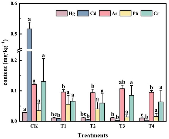 Effect of different application rates of soil conditioners on heavy metal content in rice. Note: The control group (CK) received no soil conditioner treatment; T1, T2, T3, and T4 correspond to different application rates of the soil conditioners, with T1 representing 50 kg/mu, T2 representing 100 kg/mu, T3 representing 150 kg/mu, and T4 representing 300 kg/mu. Different lower case letters indicate significant differences (p < 0.05) in heavy metal accumulation between treatments.