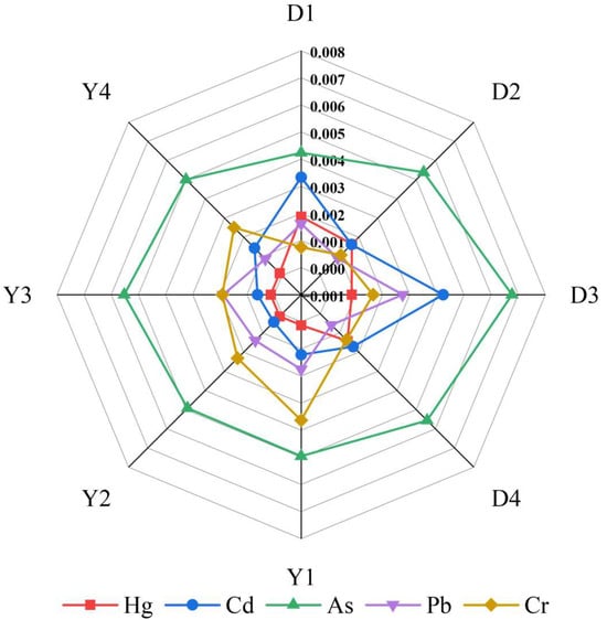 where RI is the health risk index; RfD is the heavy metal exposure reference dose [mg·(kg·d)−1]; RI > 1 indicates that the pollutant can cause health risk to human beings, and the larger the health risk index, the greater the health risk of the pollutant to human beings; RI < 1 indicates that the pollutant does not cause health risk to human beings.