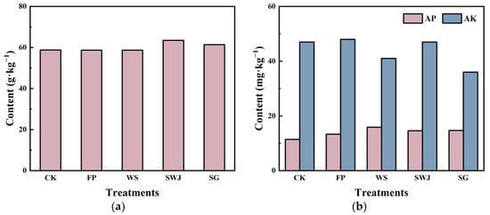 Effect of conditioners on soil OM (a), AP, and AK content (b).