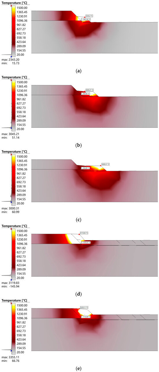 - Thermal Analysis: The peak temperature during the first-layer weld reached 3045.2 °C, ensuring complete metallurgical fusion between the weld overlay and the base materials. At the three-phase interface, the temperature peaked at 1835.2 °C during the second layer, reflecting intense thermal cycling and differential heating across the dissimilar materials.