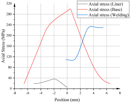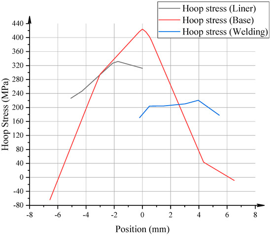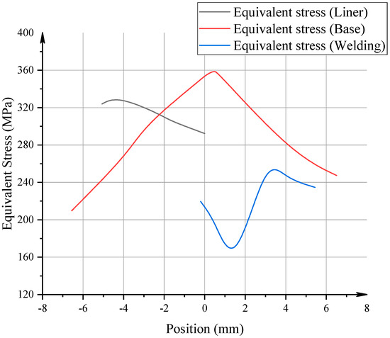 - Residual Stress Evolution: Residual stresses in the hoop, axial, and equivalent stress fields exhibited significant gradients and localization around the three-phase boundary. After the second-layer welding, the circumferential stress at the three-phase point reached approximately 300 MPa in tension. The von Mises stress peaked at 359.3 MPa in the base pipe adjacent to the transition zone, while stress peaks in the liner and weld overlay were slightly lower but still significant.