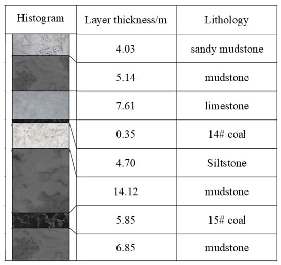 Jinneng Holding Group and Shun Yiyuan Coal Industry Co., Ltd. (referred to as “Yiyuan Coal Industry”) has a designed production capacity of 1.8 million tons per year. It is a high-gas mine, mining the No. 15 coal seam with an average seam thickness of 5.85 m, an average dip angle of 5°, and using the fully mechanized mining method for roof cutting and pressure relief. Based on the mining pressure data from the adjacent working faces, the initial collapse step distance for the immediate roof is 9.2 m, the first pressure step distance for the old roof is 32.2 m, and the periodic pressure step distance is 15 m. The roof and floor lithology mainly consist of mudstone, sandstone, and limestone. Figure 1 illustrates the stratigraphic column.