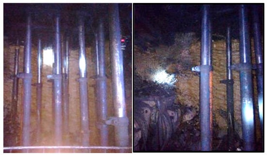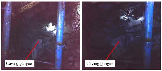 When the working face advances to the range of the roadway intervention, the working face continues to advance about 9 m, and the roof of the mined-out area collapses almost completely, with the collapse step distance reduced by about 6 m. As the temporary support with individual props and roof beams at the retreating end is removed, the roof of the side roadway in the mined-out area collapses in a timely manner. The roof collapse situation is shown in Figure 14.