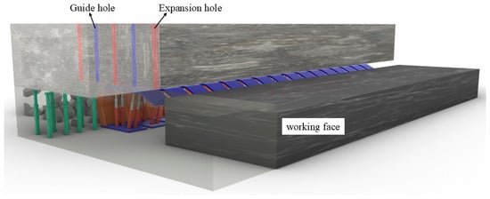 The principle of collaborative roof cutting between static stress and mining-induced stress is as follows: In the advanced working face, boreholes are drilled in the roof of the recovery roadway. Static expansion agents are filled into the holes, and the hydration reaction of the expansive agents generates expansion pressure that acts on the hole wall, creating a high-pressure state inside the hole and forming stress concentration zones along the borehole line. When the working face advances to the static stress intervention position, under the combined effect of mining-induced stress, the stress concentration zone is induced to become the location of roof fracture, causing the roof of the mining area to collapse along the borehole line in a timely manner. This achieves the engineering goal of roof cutting and pressure relief while optimizing the stress environment around the roadway. The 3D schematic diagram is shown in Figure 4.