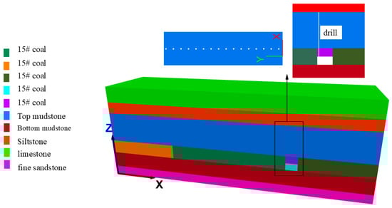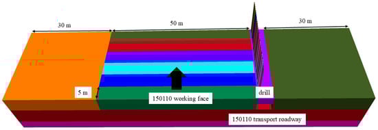Based on the actual geological conditions of the 150110 transportation roadway at Yiyuan Coal Industry, a FLAC3D numerical model is established to analyze the influence of static stress intervention on roof–rock pressure of the working face. The dimensions of the numerical model are 115 m × 30 m × 42 m (X × Y × Z), and the excavation size of the roadway is 5 m × 30 m × 3.3 m. The model’s perimeter and bottom are displacement-constrained, with fixed boundaries. The 150110 working face is buried at a depth of 300 m, and a vertical stress of 7.5 MPa is applied at the top of the model to simulate the pressure from the overlying rock layers, thirty-meter coal pillars are retained on both sides to mitigate boundary effects using the Mohr–Coulomb constitutive model. The model comprises 1,146,539 grids and 194,948 nodes. A gradient meshing strategy is adopted, where tetrahedral meshes are employed to locally refine critical research areas such as roadways and boreholes, achieving a continuous transition in mesh density from dense to sparse through a progressive gradient approach. The numerical model is shown in Figure 6, and the mechanical parameters of each rock layer are presented in Table 1.