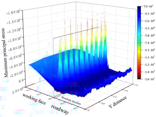 Figure 9 shows the distribution of stress in the tunnel roof after static stress intervention in the advanced working face.