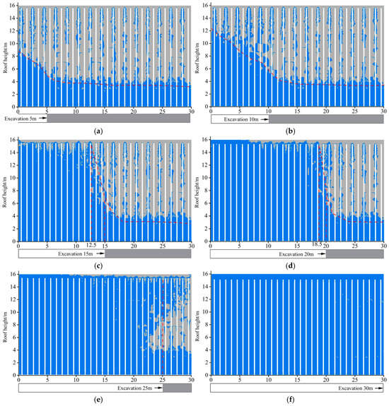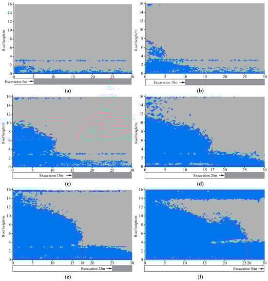From Figure 11, it can be seen that, after 5 m of excavation, partial damage occurs in the roof coal, with a maximum damage depth of 2 m. The integrity of the upper roof remains relatively good. After 10 m of excavation, damage starts to occur in the tunnel roof within the 0–5 m range, with a maximum damage depth of 8 m. At this point, the roof damage lags behind the working face by 5 m. After 15 m of excavation, the roof in the 11 m range behind the tunnel experiences damage, with a maximum damage depth of 10.1 m. At this point, the roof damage lags behind the working face by 4 m. After 20 m of excavation, the roof in the 17 m range behind the tunnel experiences damage, with a maximum damage depth of 11.8 m. At this point, the roof damage lags behind the working face by 3 m. After 25 m of excavation, the roof in the 18 m range behind the tunnel experiences damage. At this point, the roof damage lags behind the working face by 7 m. After 30 m of excavation, the roof in the 26 m range behind the tunnel experiences damage. At this point, the roof damage lags behind the working face by 4 m. As the working face advances, the roof coal has relatively low strength and experiences plastic damage first. However, the strength of the immediate roof above is relatively high, causing it to lag behind the collapse of the mined-out area roof, which helps maintain the stability of the tunnel roof before the working face recovery.