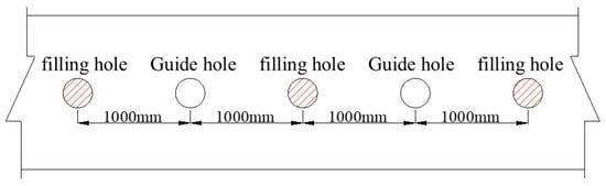 In actual engineering practice, continuous loading may lead to premature roof fractures. To provide a free surface and play a guiding role, a spaced loading method is used. Boreholes filled with static expansion agents are called charging holes, while boreholes without static expansion agents are called guiding holes. The spacing between charging holes and guiding holes is mainly determined by the performance of the static expansion agent and the strength of the roof rock. Based on previous engineering experience, three spacing options are available for the charging and guiding holes: 800 mm, 1000 mm, and 1200 mm. Through preliminary tests, a spacing of 1000 mm can effectively achieve roof cutting while maximizing material savings. The diagram of spaced loading is shown in Figure 12, and the scene of expansion borehole construction is shown in Figure 13.