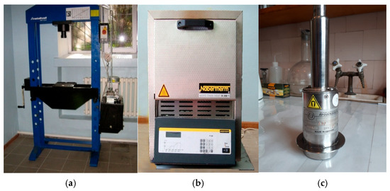 Hydraulic press Metallkraft WPP 50M (a), NOBERTHERM muffle furnace (b), magnetic separator “Prodeкoлoгiя—scientific and production” (c).