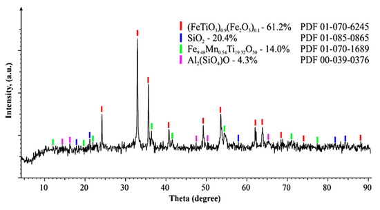 The size and mass fraction of the granules of the ilmenite concentrate are presented in Table 1, the content of titanium oxides and the main accompanying elements in Table 2, and the mineral composition is shown in Figure 2.