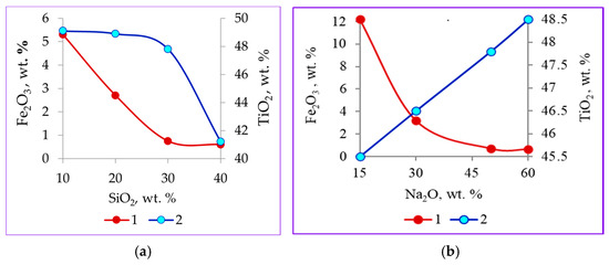 Effect of flux additives SiO2 (a) and Na2O (b) on iron reduction and slag enrichment with titanium dioxide.