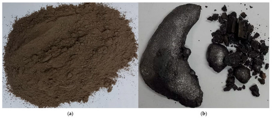 This work involved the processing of a difficult-to-enrich ilmenite concentrate (IC) from the sandy–clayey ore of the Satpayev deposit in Eastern Kazakhstan provided by the Ust-Kamenogorsk Titanium and Magnesium Plant (JSC ‘UK TMK’). Fluxing additives included anthracite with a 3.87% ash content, 3.03% technical-grade calcined soda of the highest quality (granulated, grade OKP 21 3111 0220, and powdered, grade OKP 21 3111 0120), with a sodium carbonate (Na2CO3) mass fraction of at least 99.4%, an iron content recalculated to Fe2O3 of no more than 0.003%, other impurities within trace amounts in accordance with the quality standard GOST 5100-85 [28] for calcined soda, and diatomite (also known as kieselguhr, a sedimentary natural mineral from the Mugaljar deposit in Western Kazakhstan) containing approximately 80% macroporous amorphous silica (SiO2). Molasses (a byproduct of the sugar industry) was used as a binder at a rate of 3% by weight of the coal charge with IC and fluxing additives.