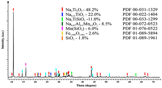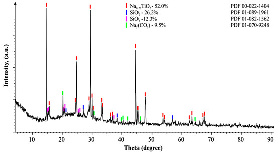 The optimization of the technological conditions for refining primary titanium slag with water resulted in a monophase titanium dioxide with intercalated sodium Na0.23TiO2 (Figure 6).
