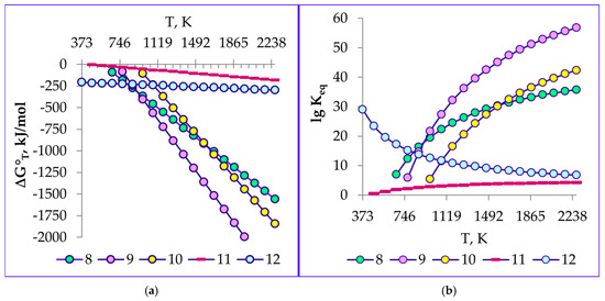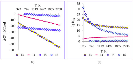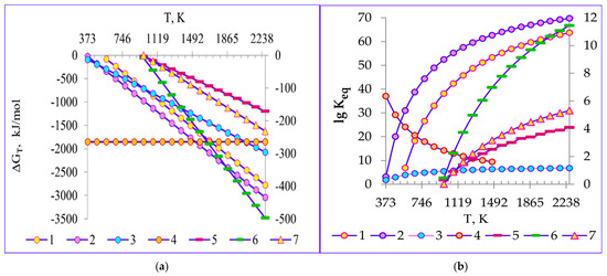 Dependence of the change in ∆G°T (a) and lg Keq (b) on the temperature of the reactions forming titanium oxide and silicon–titanium oxide electrode materials.