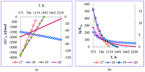 Dependence of the change in ∆G°T (a) and lg Keq (b) on the temperature of calcined soda decomposition reactions.