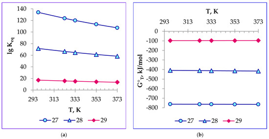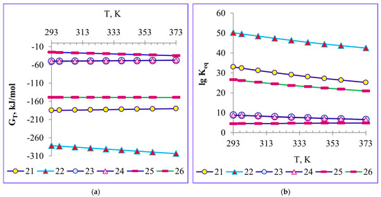 Dependence of the change in ∆G°T (a) and lg Keq (b) on the temperature of hydrothermal decomposition reactions of manganese dioxide intercalate.