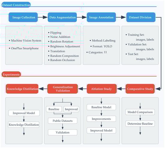 This study followed a systematic technical approach encompassing data acquisition, model refinement, and validation, as depicted in Figure 1. Initially, shrimp meat sample images were captured using a machine vision system and a OnePlus Ace2 smartphone (OPPO, Shenzhen, China) to gather raw data from various perspectives and backgrounds. Subsequently, the data underwent enhancement procedures, such as inversion, random angle rotation, brightness adjustment, translation, noise addition, random occlusion, and random combination, to bolster the model’s robustness and generalization capabilities. The LabelImg tool was utilized to annotate samples across 11 categories in YOLO format, with the dataset partitioned into training, validation, and test subsets at an 8:1:1 ratio.