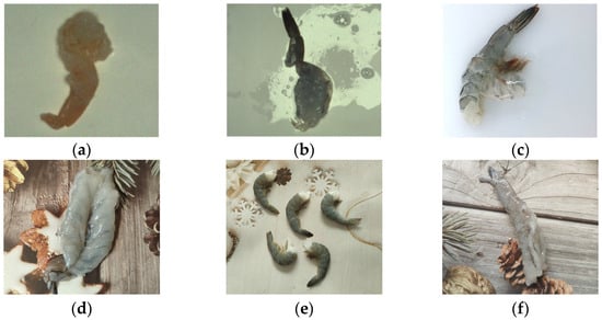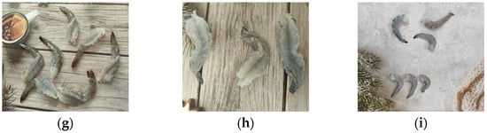 • Quality-defect category: This category included samples exhibiting dehydration and discoloration, damage, incomplete shell removal, incomplete intestinal gland removal, or the presence of shell fragments or appendages (Figure 2a–e), totaling five subcategories;