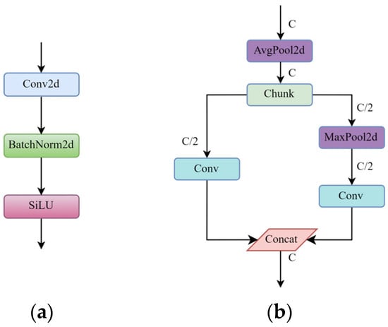 The conventional downsampling convolutional layer in the YOLOv11 network architecture was substituted with the Adown module [20] to decrease feature map resolution. Figure 5 illustrates a comparison between the conventional downsampling approach (Figure 5a) and the structure of the Adown module (Figure 5b). The configuration and data flow of the Adown module are delineated as follows.