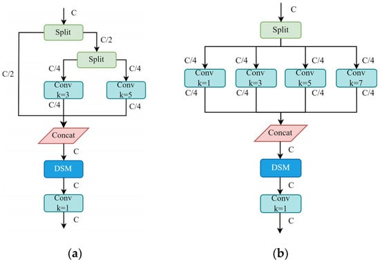 The MSConv module extends the DSConv design to process input features using four sub-branches. Given an input feature map X R N × C × H × W , it was first divided into four sub-spaces along the channel dimension. These sub-branches were processed in parallel using convolutional kernels of sizes 1 × 1, 3 × 3, 5 × 5, and 7 × 7 to capture key information from local fine structures to broader receptive fields. The outputs from these four parallel branches were then concatenated along the channel dimension and integrated through a 1 × 1 convolution, producing the final feature map Y R N × C × H × W . The computation was defined as: