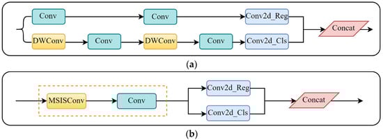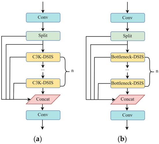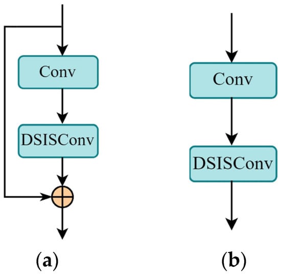 The C3K2–DSIS module was created by integrating the DSISConv module into the C3K2 framework of YOLOv11. This module maintains the fundamental architecture of C3K2, but substitutes the second convolutional layer within the bottleneck structure. Figure 7 depicts the schematic layout of the bottleneck-DSIS block, which functions as the foundational component of C3K2–DSIS. The bottleneck-DSIS block includes a residual connection when its shortcut parameter is set to True (Figure 7a) and omits it when set to False (Figure 7b).