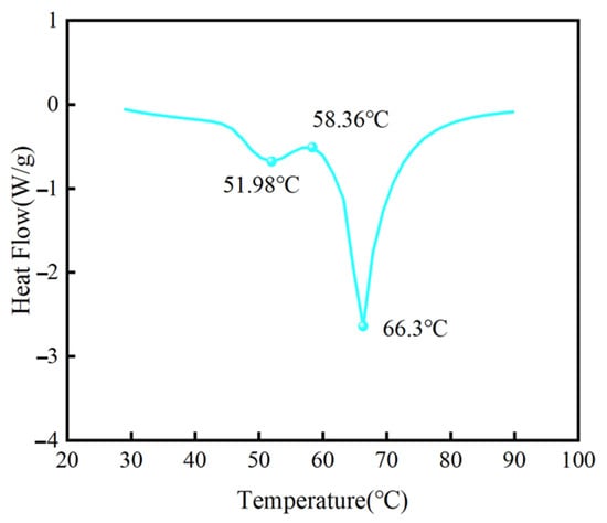This research selected paraffin as the phase-change material for the latent heat energy storage system. The paraffin, provided by Shanghai Yijiu Chemical Co., Ltd. (Shanghai, China), with the model number 68 (the melting point varies within the range of 68 ± 2.5 °C). Paraffin, recognized as a highly effective phase-change material, offers excellent chemical stability, is non-toxic, and maintains its integrity without periodic degradation. This makes it an ideal candidate for efficient latent heat storage within a specific temperature range. The melting point refers to the temperature at which the PCM transitions from solid to liquid, while the melting enthalpy represents the amount of latent heat energy the material can store during this phase transition. Both of these factors are crucial in determining the overall performance of PCMs in energy storage applications. The melting point and the enthalpy of the fusion of paraffin were accurately measured using differential scanning calorimetry (DSC) technology, following the SH/T0589-94 [] standard. The measured values were 66.3 °C and 199.2 kJ/kg, respectively. Figure 1 presents the specific results of the DSC analysis.