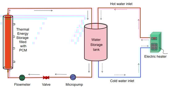 Figure 2 illustrates the schematic layout of the experimental system, which primarily consists of an electric heater(Valerias Fluid Technology (Guangzhou) Co., Ltd., Guangzhou, China), a water storage tank with insulated materials, a thermal energy storage module. The electric heater has been added in the text according to the requirements, while the two devices, a water storage tank with insulated materials and a thermal energy storage module, are custom-made by us, and a temperature recording and data acquisition system. There are two water flow loops in the present work. One is the water heating loop, where cold water is heated by the electric heater and then flows back to the hot water tank to a predetermined temperature and maintains a constant temperature. Water was supplied by a pump and flowed through an electric heater, then traveled to the water storage tank and remained at the preferred temperature for use. The alternative loop, referred to as the charging loop, enables some hot water to flow through the thermal energy storage module, facilitating heat transfer to the phase-change material (PCM) during the charging phase. Before the water enters the thermal energy storage module, both its flow rate and temperature are measured. The water flow rate was determined using a metal rotor flowmeter(Suzhou Jiayi Instrument Co., Ltd., Suzhou, China), this device features a measurement range of 100 to 1000 L/h and offers an accuracy of ±1.5%. Additionally, a T-type thermocouple was installed at the inlet of the thermal storage device, and another T-type thermocouple was placed at the outlet.