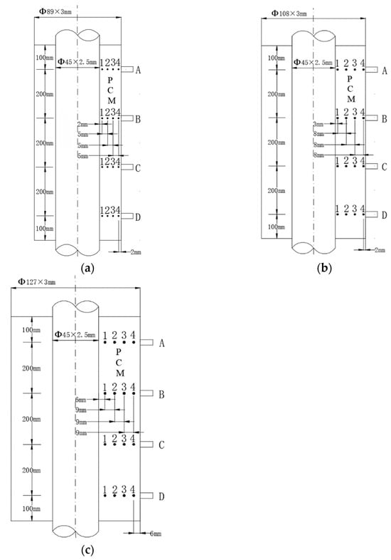 This study utilizes type T thermocouples, which have a temperature range from −40 °C to +125 °C and an accuracy of ±0.5 °C. Each shell-and-tube latent heat storage system is fitted with 16 type T thermocouples to monitor the temperature distribution throughout the device. The thermocouples are integrated into the phase-change material (PCM) along both the axial and radial directions. The axial locations of the thermocouples within the PCM are designated as A (700 mm), B (500 mm), C (300 mm), and D (100 mm), with four thermocouples placed at each position, as depicted in Figure 3. The thermocouples at the radial positions are denoted as 1, 2, 3, and 4 (as shown in Figure 3), located in the annular space between the inner tube and the outer shell. In Figure 3a–c, the distances between two adjacent thermocouples in the radial direction are 5 mm, 8 mm, and 9 mm, respectively, while the distances from the thermocouple at position 1 to the inner tube are 2 mm, 3 mm, and 6 mm, respectively. The data acquisition system employs the Agilent 34901A data acquisition instrument to collect and record temperature data every 10 s.