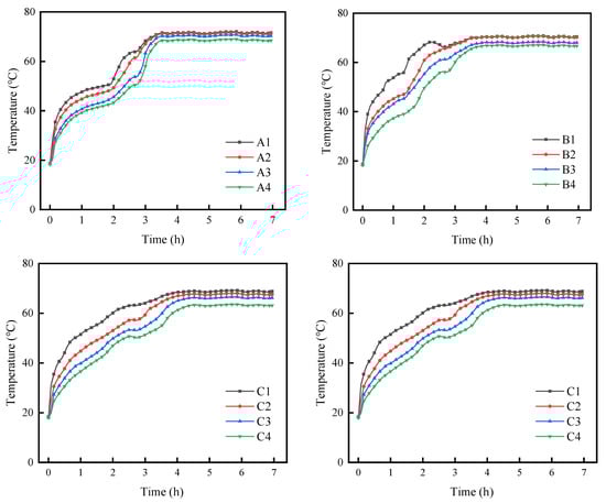 The heat transfer efficiency of the PCM under thermostatic water flow was measured by comparing different variables. Prior to the formal experiment, a preliminary investigation was conducted utilizing an inlet temperature of 75 °C and a flow rate of 9 L/min, tube I, an inclination angle of 45°, and the water entering from the bottom. The temperature charts of four cross-sectional areas A, B, C, and D under the proposed conditions were compared (Figure 4). Since the temperature variation trends of the four cross-sections were in good agreement, point C2 was taken as the experimental point for subsequent experimental research.