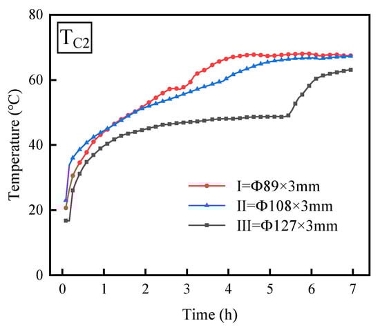 Timewise variations in the temperatures of the PCM at location C2 for different diameters. (Inlet temperature of 75 °C, inclination angle of 45°).