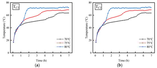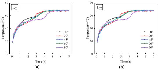 Figure 6a shows the effect of different inclined angles on the temperature variation in PCM within tube I of a shell-and-tube thermal storage system, with the water inlet temperature set to 75 °C, and with water flowing in from the bottom while exiting from the top. The figure reveals that, as time progresses, the temperature variation patterns of the PCM across different inclination angles show a generally similar trend. In the initial phase, the temperature rises sharply, followed by a relatively mild growth phase, and ultimately accelerates again until thermal equilibrium is reached. However, the temperature change patterns at different inclined angles exhibit significant temporal differences; with the inclination angle rising from 0° to 90°, the time needed for the PCM to reach equilibrium becomes longer, and the melting rate decreases. For example, during the first hour, the PCM temperatures at all five inclined angles rise sharply, during which the PCM absorbs a considerable amount of sensible heat. As time progresses, the temperature near the inner tube reaches the melting point of the PCM, initiating the melting process. The melting region is more uniformly distributed around the inner tube at an inclination angle of 0°, with a faster melting rate, resulting in the temperature at measurement point C2 being higher than at other angles during 1 to 3 h. However, as natural convection takes effect, once the solid PCM in the upper section has largely melted, the temperature gap between the molten PCM lessens, leading to reduced natural convection intensity. Consequently, the melting rate slows down during 3 to 4 h, and the temperature increase in the PCM decelerates, ultimately reaching thermal equilibrium after 4 h. In contrast, at an inclination angle of 90°, the melting rate accelerates between 3.5 and 5 h, causing the PCM temperature to rise rapidly, reaching thermal equilibrium after 5 h. This is because, at an inclination angle of 90°, the vertical circulation formed maintains its intensity throughout the process, thus accelerating the melting rate in the later stages and causing a rapid temperature increase []. By comparison, at inclination angles of 30°, 45°, and 60°, the PCM temperatures during the initial half of the melting process are lower than those at an inclination angle of 0°. Conversely, in the latter half of the melting process, the situation is reversed. Additionally, the times for the PCM to reach thermal equilibrium are 4.2 h, 4.5 h, and 4.6 h, respectively. To further validate this result, we increased the water temperature to 80 °C and tested the temperature variations in the phase change material (PCM) under conditions of 0°, 45°, and 90° inclination angles. As shown in Figure 6b, the same conclusions were drawn.